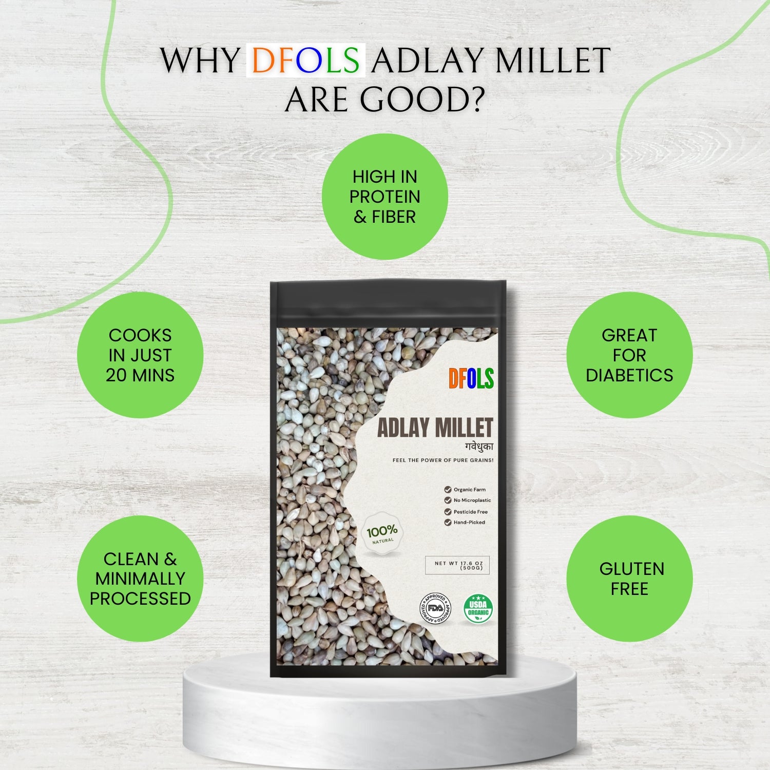 | Is DFOLS Adlay Millet organic? | Yes, it is USDA Organic certified, pesticide-free, non-GMO, and hand-picked for purity. |