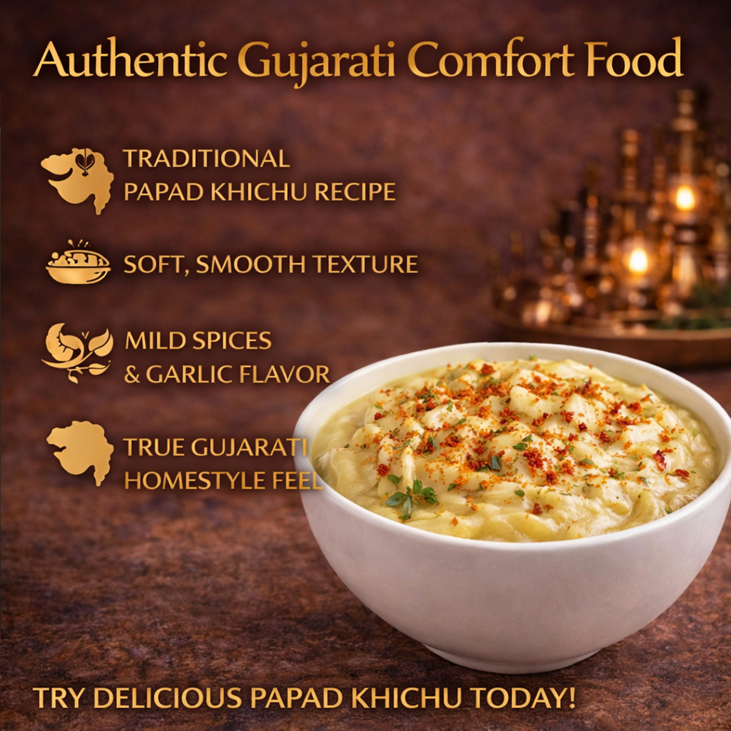 | What is Papad Khichu? | A Gujarati snack made from spiced rice flour dough, soft and flavorful. |
